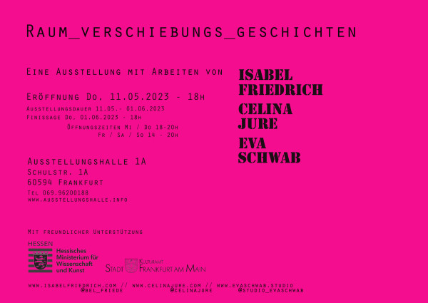 Space Shift Stories - Raumverschiebungsgeschichten is a collaborative ongoing exhibition project that seeks to foster a deep and meaningful artistic dialogue between three artists - Isabel Friedrich and Eva Schwab from Germany and Celina Jure from Argentina. The project aims to facilitate networking opportunities and pave the way for joint exhibition projects in the future, building on the connections forged through this shared experience. (...)