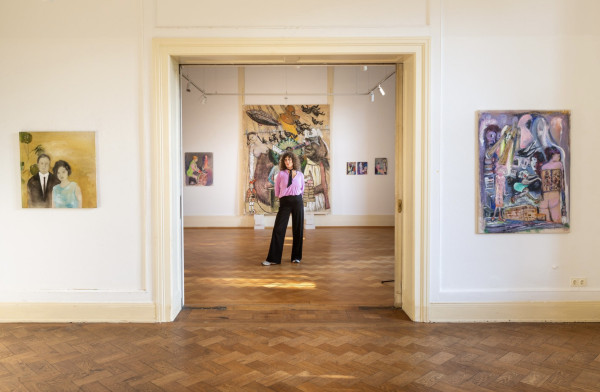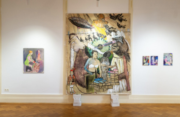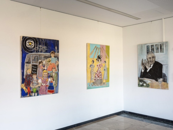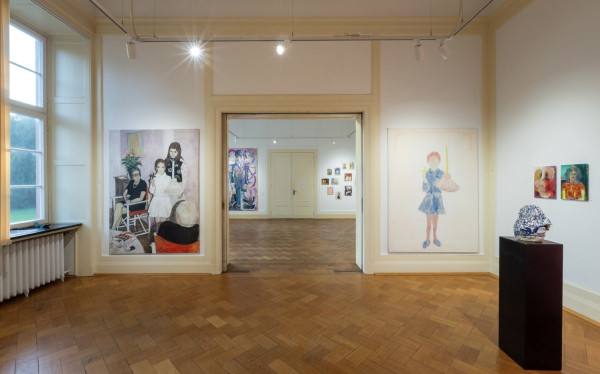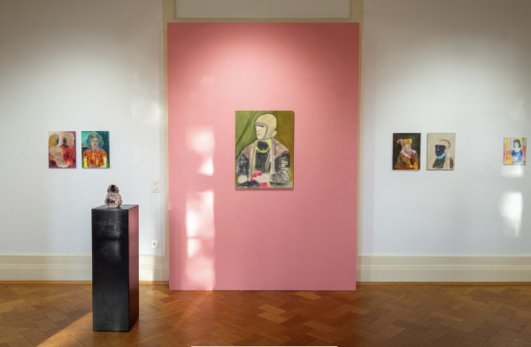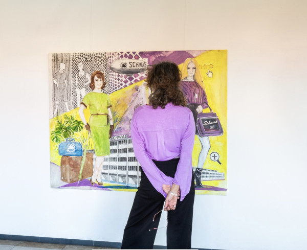 In der Remisengalerie des Hanauer Kulturvereins/Schloss Philippsruhe schließlich zeigt Eva Schwab ein drittes malerisches „Nachbilder“ Universum. Ausgewählte Werke aus ihrem umfang- und facettenreichen malerischen Fami- lienalbum werden dort in neuer Konstellation in Dialog zueinander treten. Protagonistinnen und Pro-tagonisten in ihrer Enkaustik-Technik gemalten Szenerien sind über- wiegend weibliche Stellvertreter, wahlverwandtschaftliche Familienmitglieder, Mischwesen aus Pop-, Kultur- und Kunstgeschichte sowie metaphysische und zeitgeschicht- liche Testimonials.